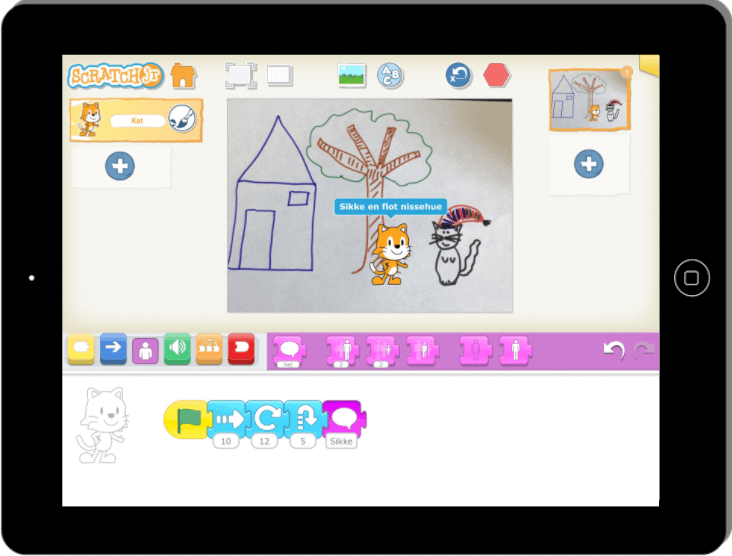 - Klassen opdeles i grupper med 2 elever i hver og de får en ipad. De lærer hvordan man åbner appen ScratchJr og laver et nyt projekt. De ser, hvordan man kan tage et billede af den første tegning og bruge det i appen til en baggrund til deres første scene. Så skal de hver vælge en figur, som skal være med på tegningen og få den til at gøre noget sjovt. Det kan fx. være at de får figurerne til at dreje rundt, hoppe, gå frem og tilbage, blive større eller mindre med mere.
